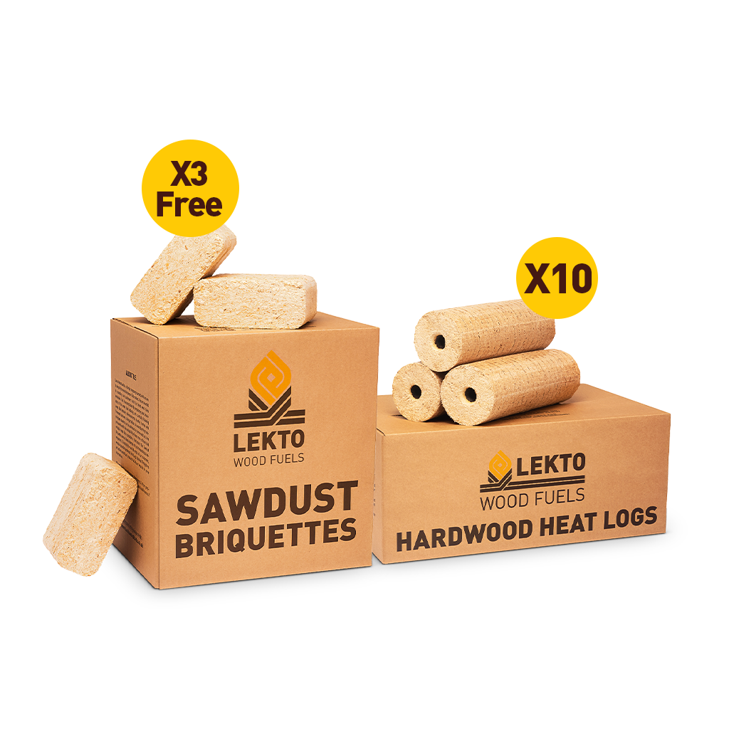 A great deal for those who value one! Being our flagship value bundle, the 2026 Mega Bundle combines a great mix of products with unbeatable savings. Designed with both new and existing Lekto clients in mind, the bundle gives you 3 FREE Mini Packs of our easy-to-use Sawdust Briquettes (£71.85 value) with the purchase of 10 boxes of Hardwood Heat Logs.