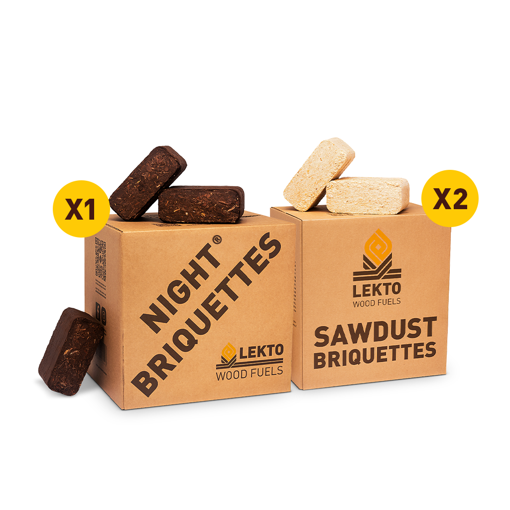 Warmth comes in all shapes and sizes. This fun-sized bundle offers the perfect 2:1 mix of Sawdust Briquettes and Night Briquettes. Easy to use and high on heat output, Sawdust Briquettes are the perfect solution for keeping your home warm all winter long. And being able to burn for up to 8 hours, Night Briquettes are the most convenient and economical wood fuel on the market. Use them in tandem to get the best of both worlds.